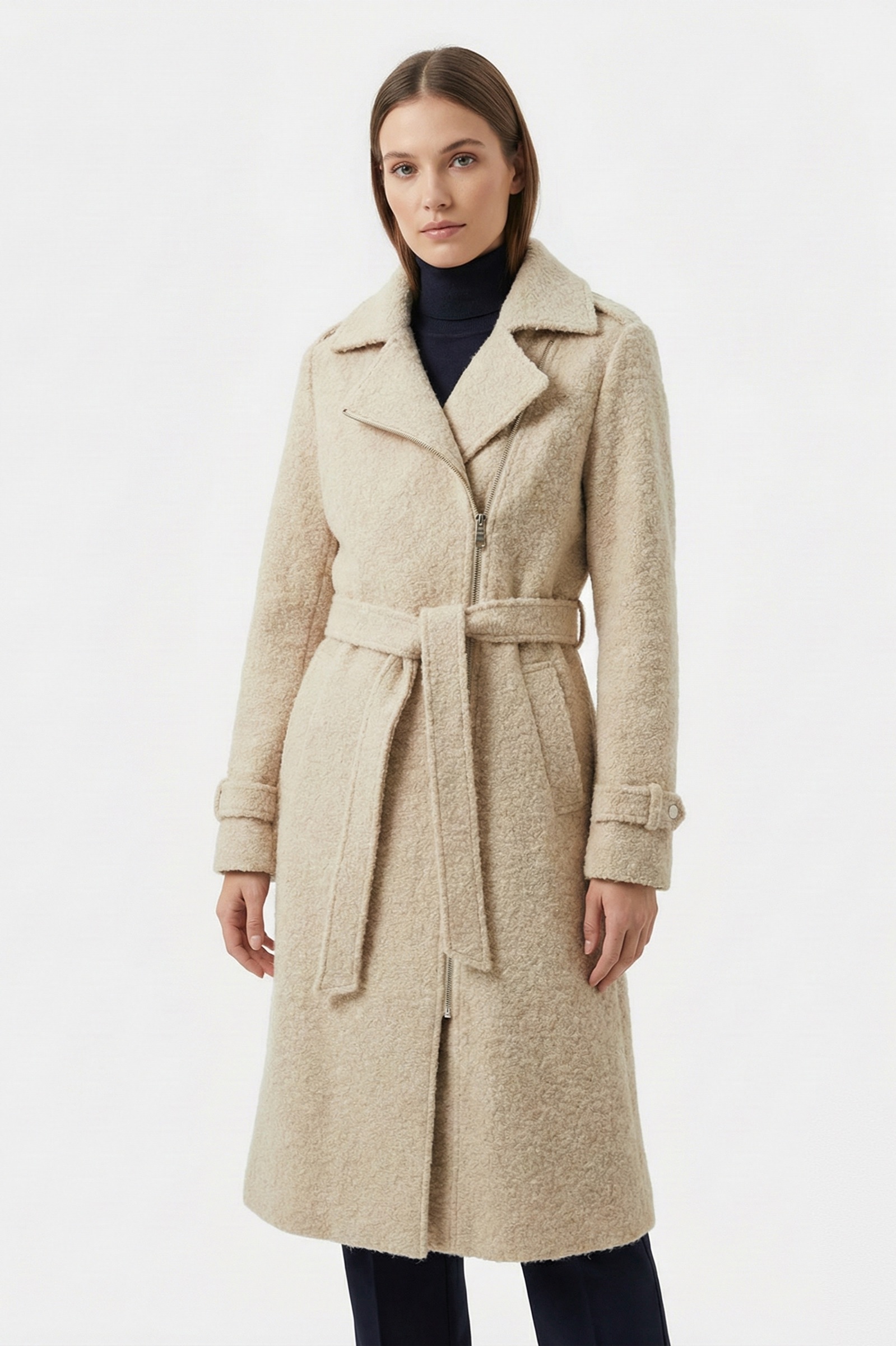 Soğuk havalarda stilinizden ödün vermeden ısının. Yumuşak dokulu kumaşı ve modern kesimiyle öne çıkan bu kaban, kış gardırobunuzun vazgeçilmezi olmaya aday. Biker ceket esintili asimetrik fermuar kapaması, klasik kaban görünümüne dinamik bir hava katarken, beldeki kuşak detayı silüetinizi zarifçe vurgular.