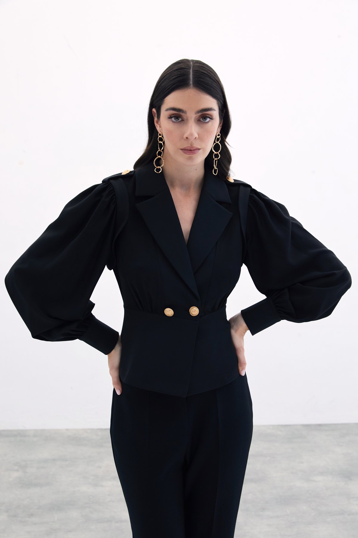 Zamansız ve şık tasarımıyla öne çıkan kruvaze kısa ceket, siyah rengiyle hem günlük hem özel kombinlerinizde kusursuz bir görünüm sunar. Yakalı kruvaze kesimi, gold detaylı düğmeleri ve omuz detayı ile klasik şıklığı modern dokunuşlarla buluşturur. Kaliteli kumaşı, kısa kesimi ve dikkat çekici duruşuyla blazer stilini her mevsim kullanabilirsiniz. Pantolon, etek veya şortlarla kombinlendiğinde sofistike ve dengeli bir stil yaratır.