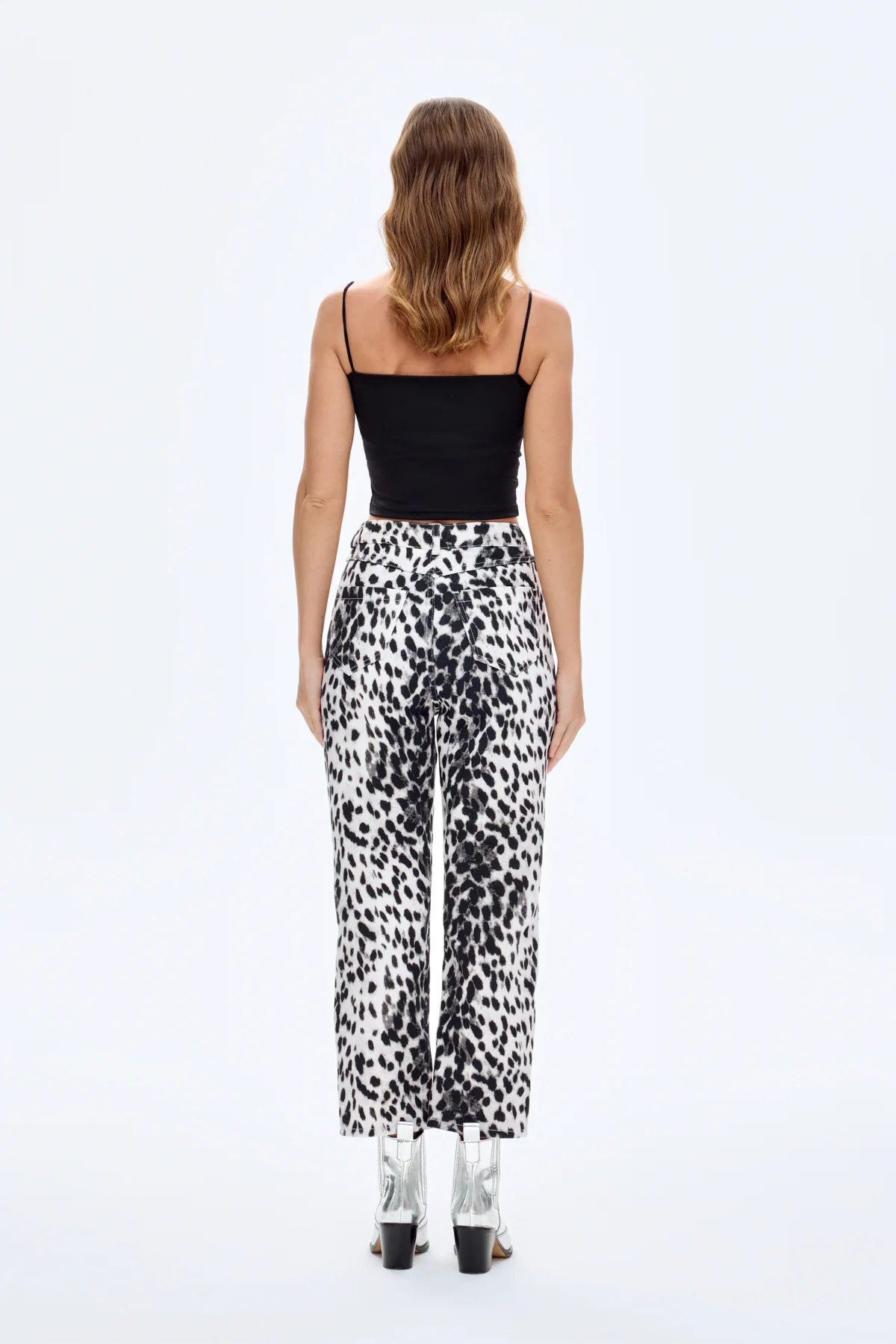 Leopar desenli bu pantolon, yüksek bel kesimi, fermuarlı ve düğmeli kapanışı ile hem dikkat çekici hem fonksiyonel bir seçenek sunar. Düz paça tasarımı, cepleri ve %100 pamuk kumaşıyla şıklığı günlük konforla buluşturur. Ürün boyu yaklaşık 99 cm’dir.