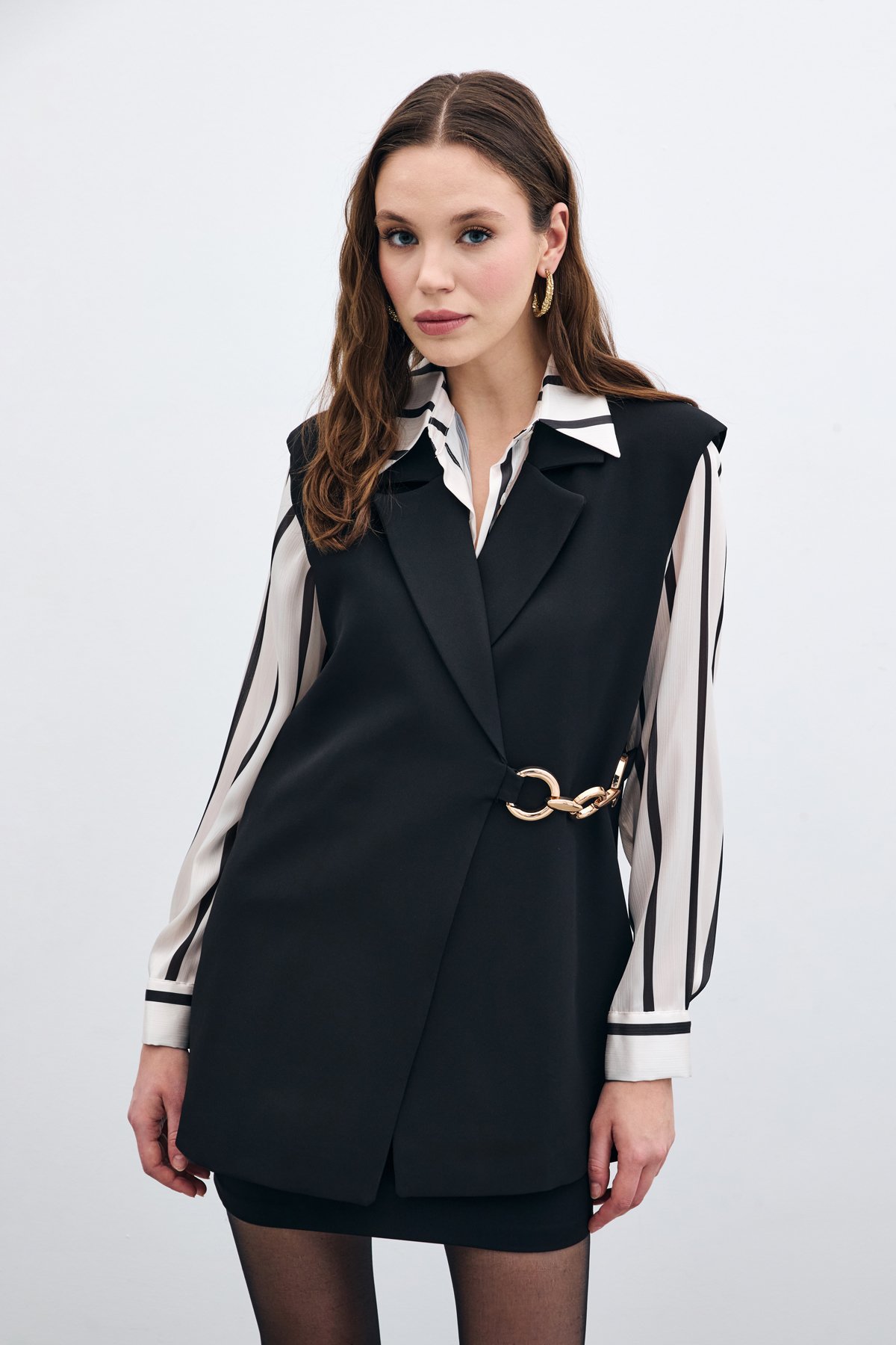 Yan Aksesuarlı Uzun Yelek – Siyah